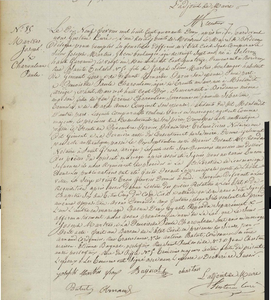 Peu de emps plus tard vers 1840/41, , elle rencontre Joseph Martres et s'installe avec lui à Bordeaux au n° 50 de la rue Saint Eulalie.