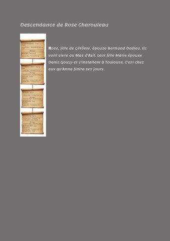 Descendance de Rose Charouleau Rose, fille de Gérôme, épouse Bertrand Dedieu. Ils vont vivre au Mas d'Azil. Leur fille Marie épouse Denis Gouzy et s'installent à Toulouse. C'est chez eux qu'Anna finira ses jours.