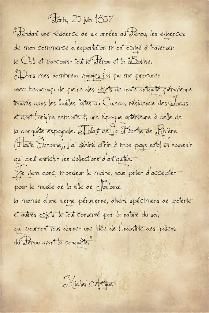 C'est dans ce contexte que Michel en tant que négociant a souhaité émigrer au Pérou. Il a été le déclencheur des recherches faites par M. Pascal Riviale sur l’archéologie au Pérou.