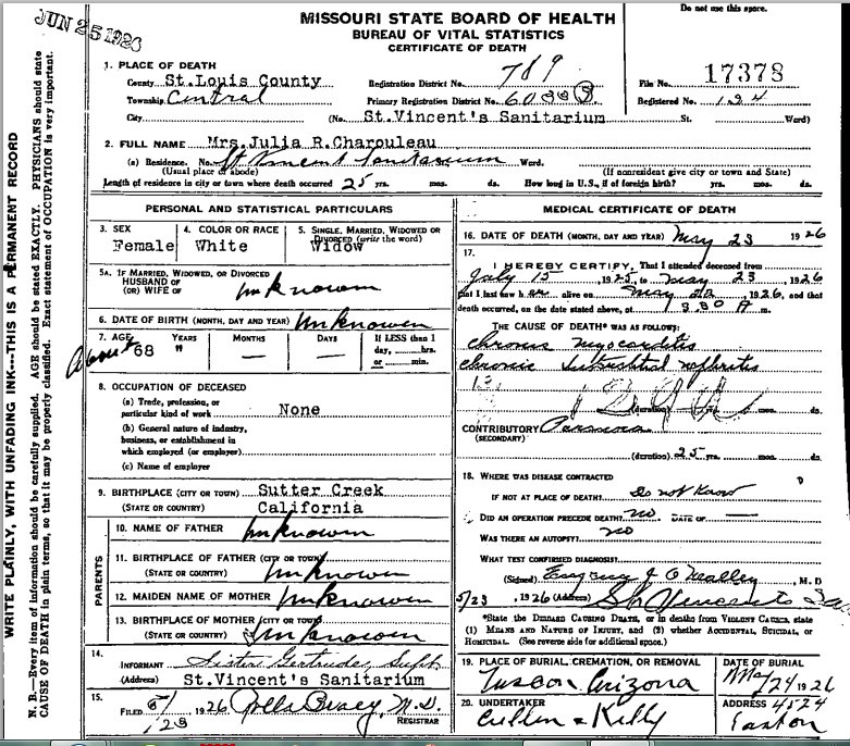 Elle finira ses jours au sanatorium Saint Vincent à Saint Louis dans le Missouri. Elle y décèdera le 23 mai 1926.