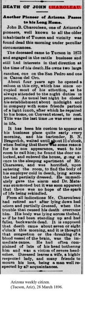 John B. Charouleau, l'un des Pionniers, bien connus de tous les anciens habitants de Tucson et des environs a été trouvé mort ce matin dans des conditions particulières.