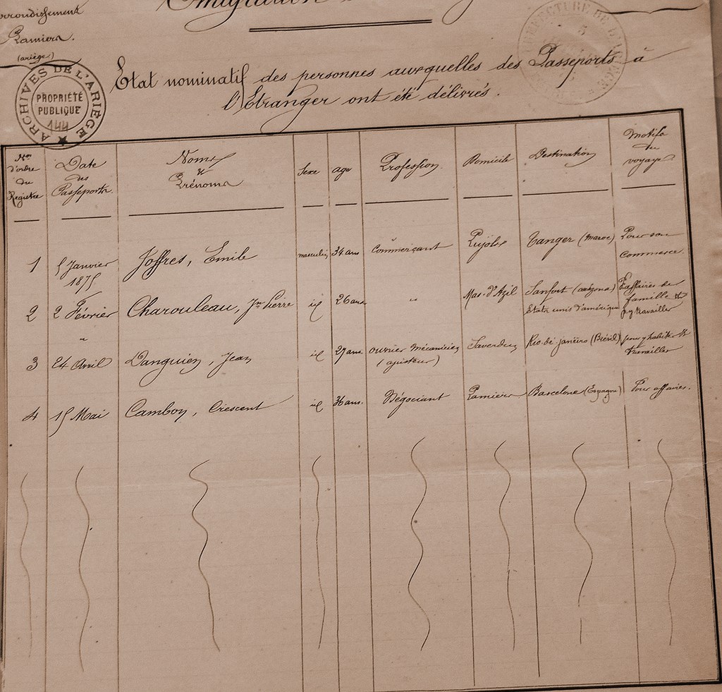 En 1875, j'ai fait appel à Jean, frère de Pierre, mon second neveu. Il a été enregistré pour une demande de passeport à Saint Girons le 2 février pour dit-il « affaires de famille et y travailler ».