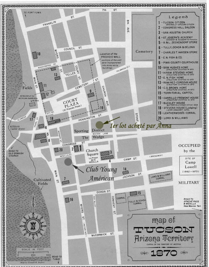En 1869, je vivais seule à Tucson, sous mon nom mon nom de jeune fille jusqu'à ce que je me remarie. J'ai déclaré n'avoir que 47 ans alors que j'en avais 10 de plus…. (petite coquetterie de ma part), que je possédais des biens immobiliers d'une valeur de 15 000 $ et une propriété personnelle de 10 000 $ (soit au total une valeur de 402 000 € aujourd'hui) En utilisant l’argent que j'ai gagné au Mexique, je me lance dans les affaires en tant que vente au détail et de prêteur sur gages, avec un taux d’usure de 20 % sur les prêts pour biens meubles et de 5 à 10 % sur les terres, habituellement couverts par un prêt hypothécaire. Ceci m'a permis de récupérer les terres et les biens de tous ceux qui ne pouvaient pas me rembourser.