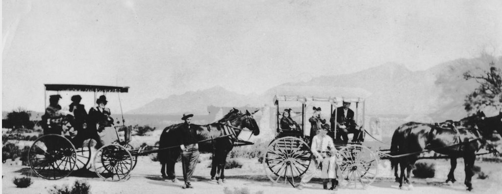 En photo, la famille de Pierre Charouleau visitant les ruines de Fort Lowell vers 1900. On reconnait dans le buggy à gauche Angélina, dans le buggy à droite, Louise et Anna avec leur Père Pierre.