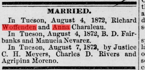 Le 4 Août 1872, j'épouse Richard Woffenden lors d'une cérémonie dans la Cathédrale San Agustin de Tucson.