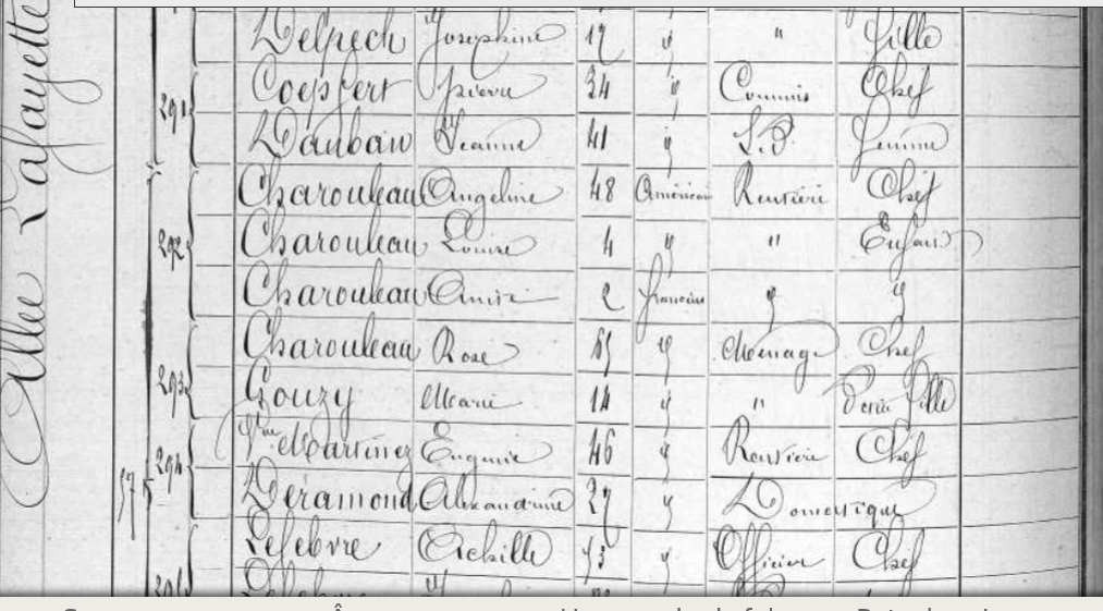 Recensement en 1891 d'Angélina et ses filles qui résidaient durant leur séjour en France chez Rose qui vivait avec sa petite fille Marie Louise.